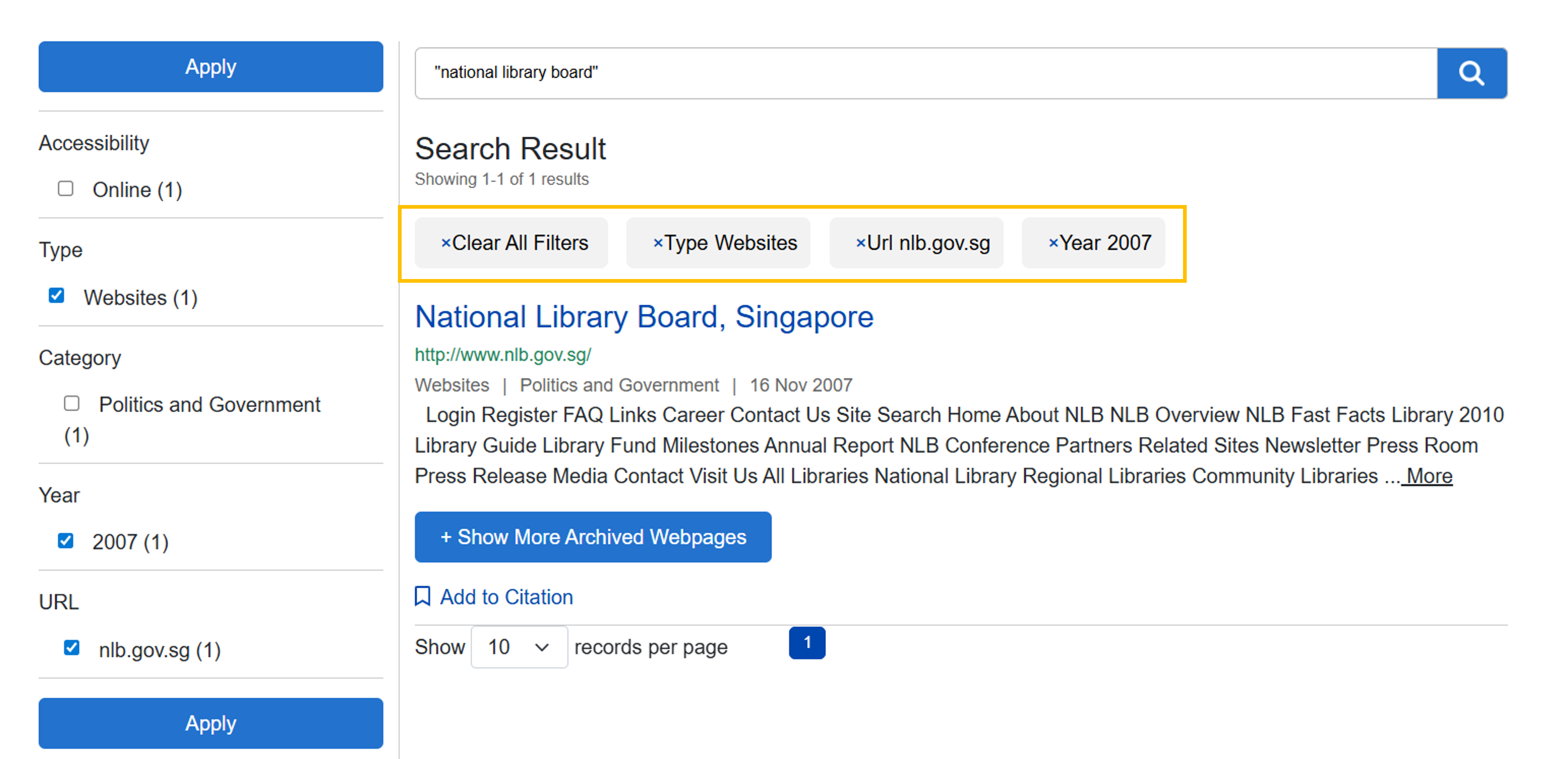 Websites: To view archived websites only. This refers to website that have been archived in its entirety (i.e. homepage and all related webpages of that website). Selecting this filter will return the record where you can view all the archived versions of that website.