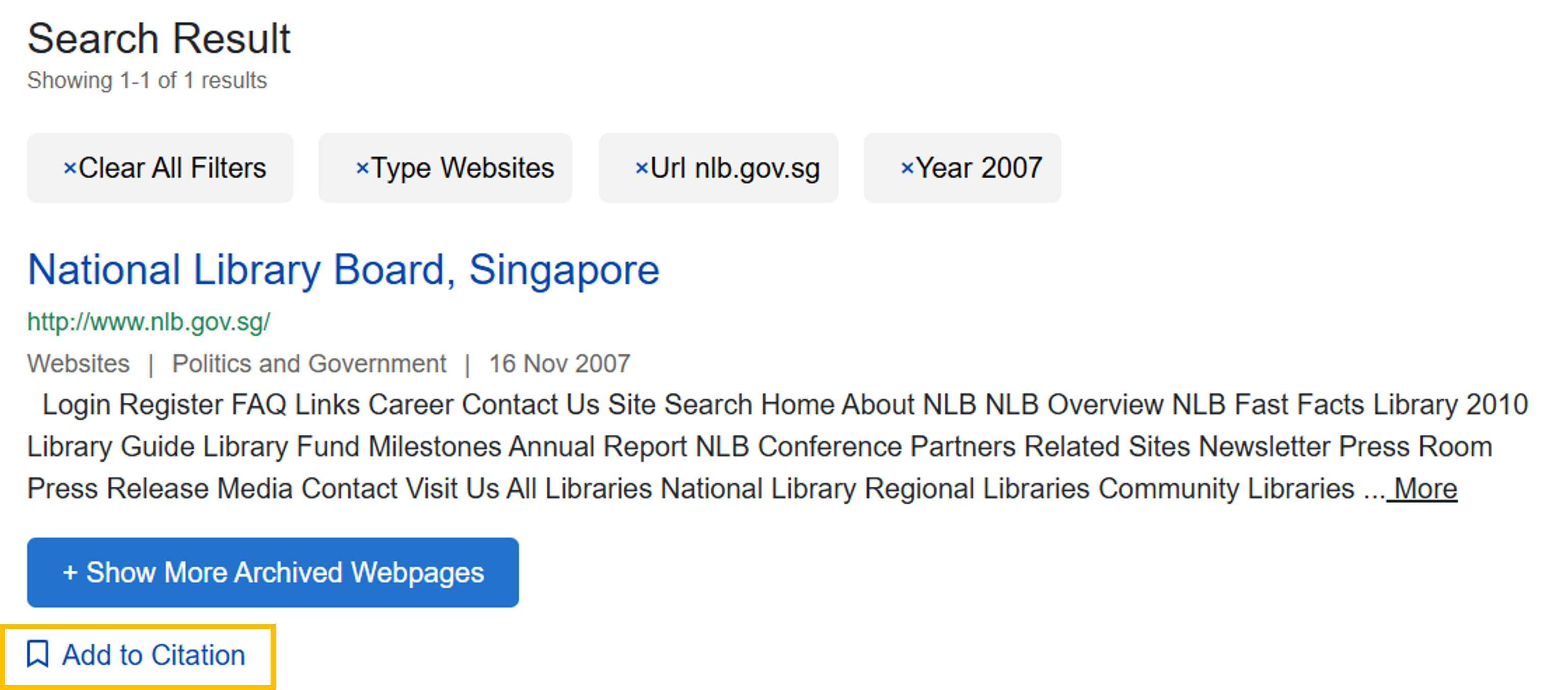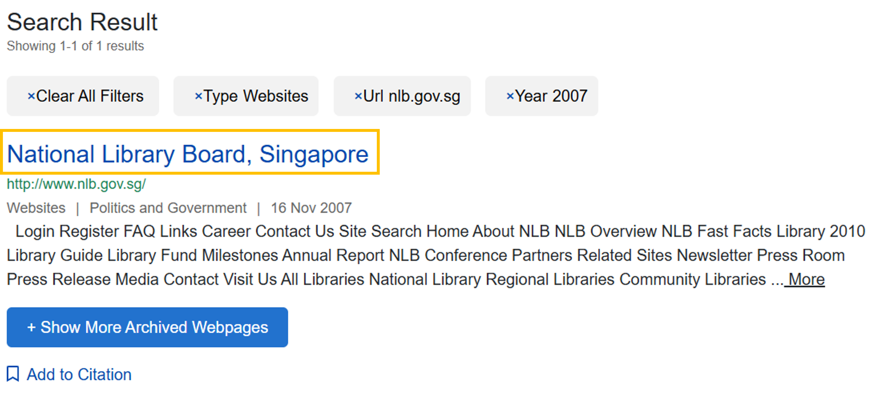 If you know the website URL that you are searching for, input the URL in the search bar, e.g. nlb.gov.sg. This search method will likely return the most accurate results.