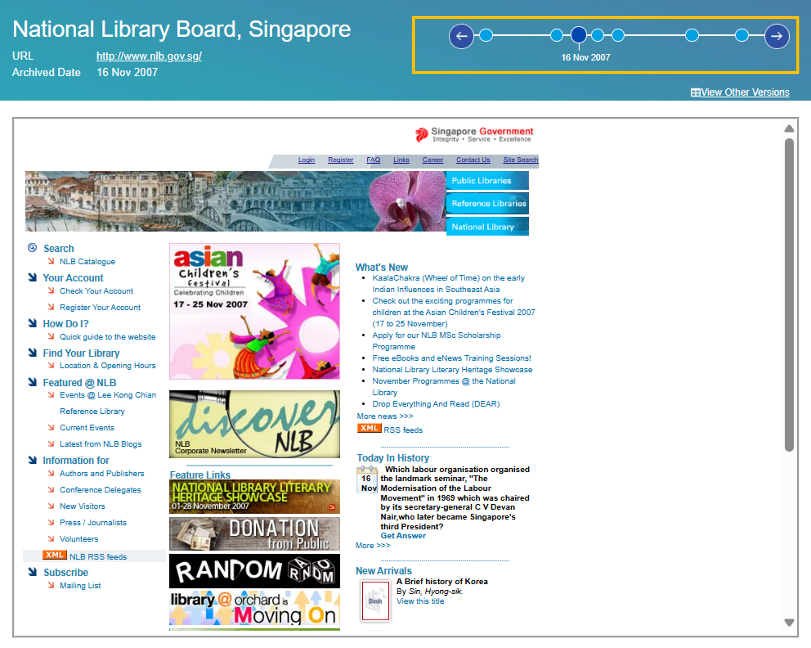 This is what the NLB website looked like on 16 Nov 2007. To view other archived versions of the NLB website, you can either select the dates shown in the timeline bar or ‘View Other Versions’ for the complete list of dates.