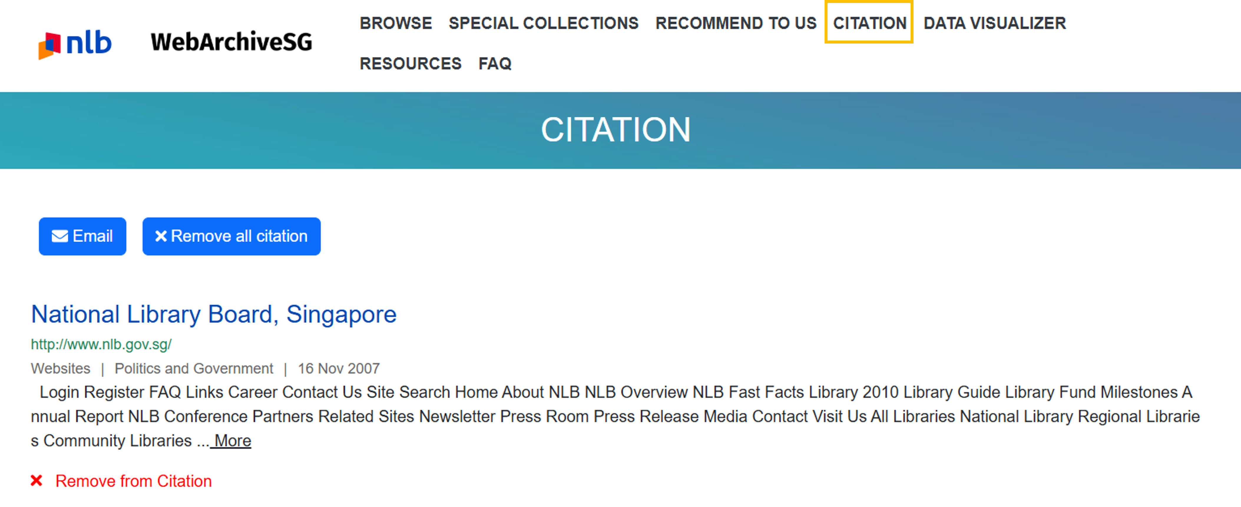 The library’s archived websites collection dates from 2006 and contains over 100,000 unique archived websites and webpages and more than 380,000 archived versions (snapshots of the same website over time). The collection includes all publicly available .sg websites which the library has a mandate to collect under the National Library Board Act since 2019, and a selection of non .sg websites that are owned by Singaporeans or Singapore organisations/institutions via permission seeking. The collection is accessible though the WebArchiveSG (WAS) portal.