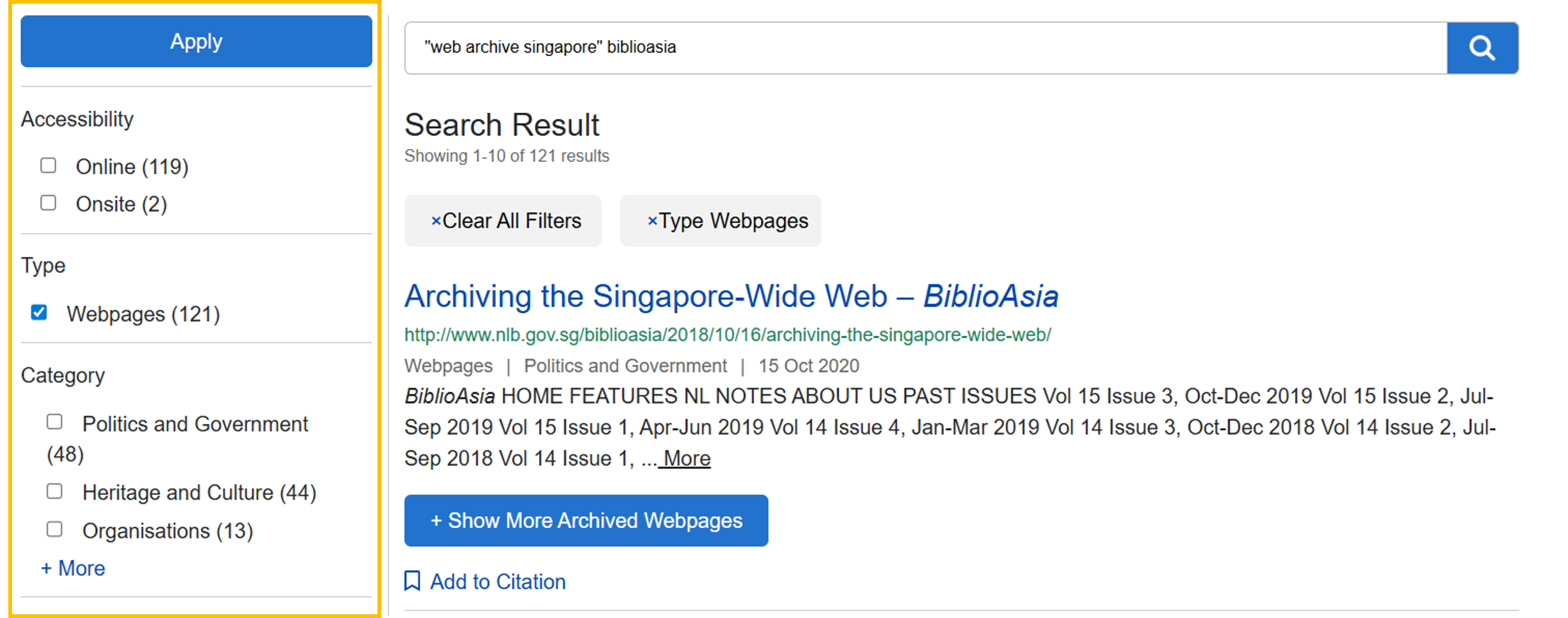 In this example of searching for the BiblioAsia blog article on the WebArchiveSG, we searched for the keywords ‘“web archive Singapore” BiblioAsia’ and applied the following filters as pictured below.