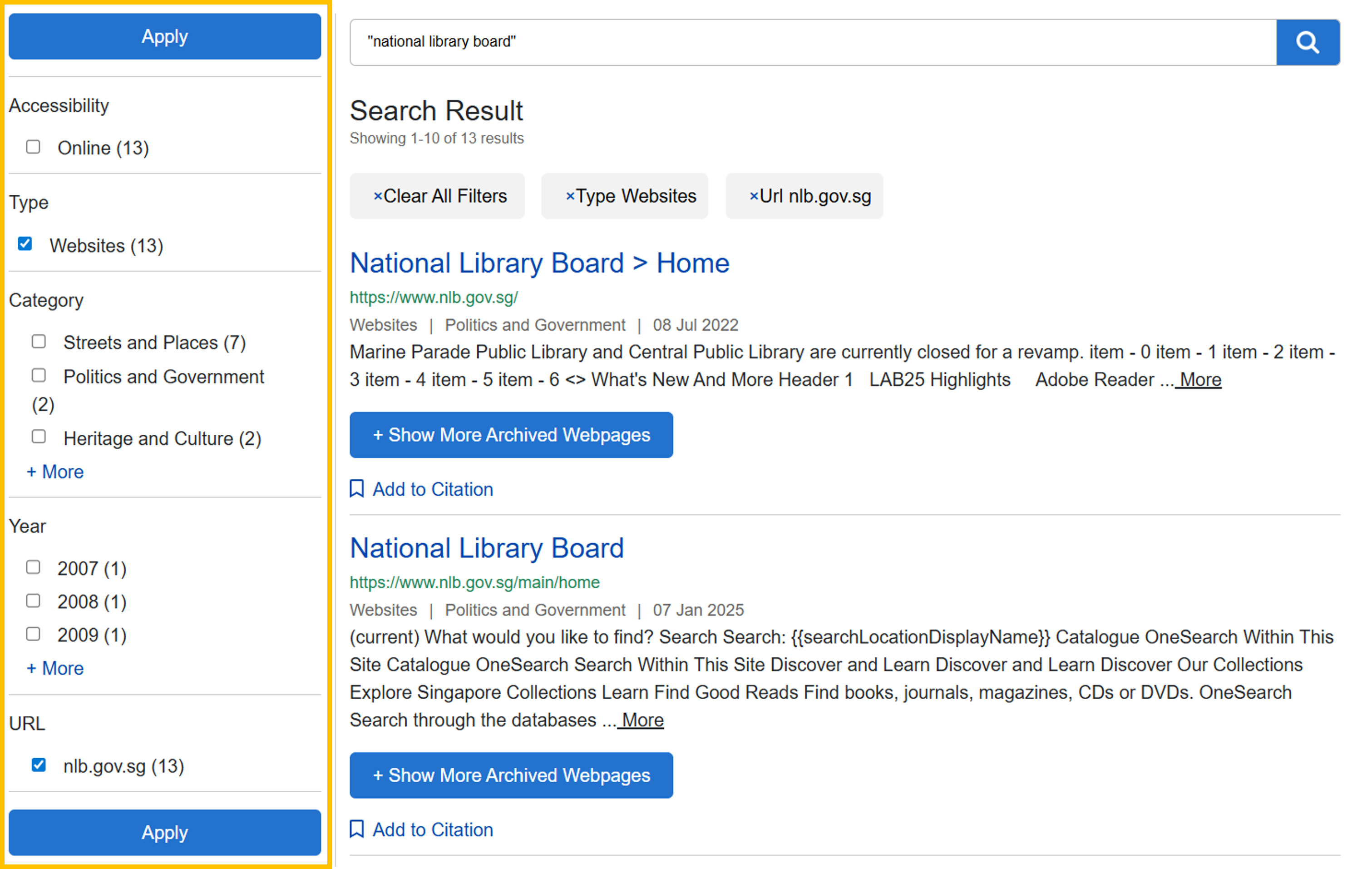 In this example of searching for the National Library Board (NLB) website, we searched for the phrase “National Library Board” and applied the following filters as pictured below.